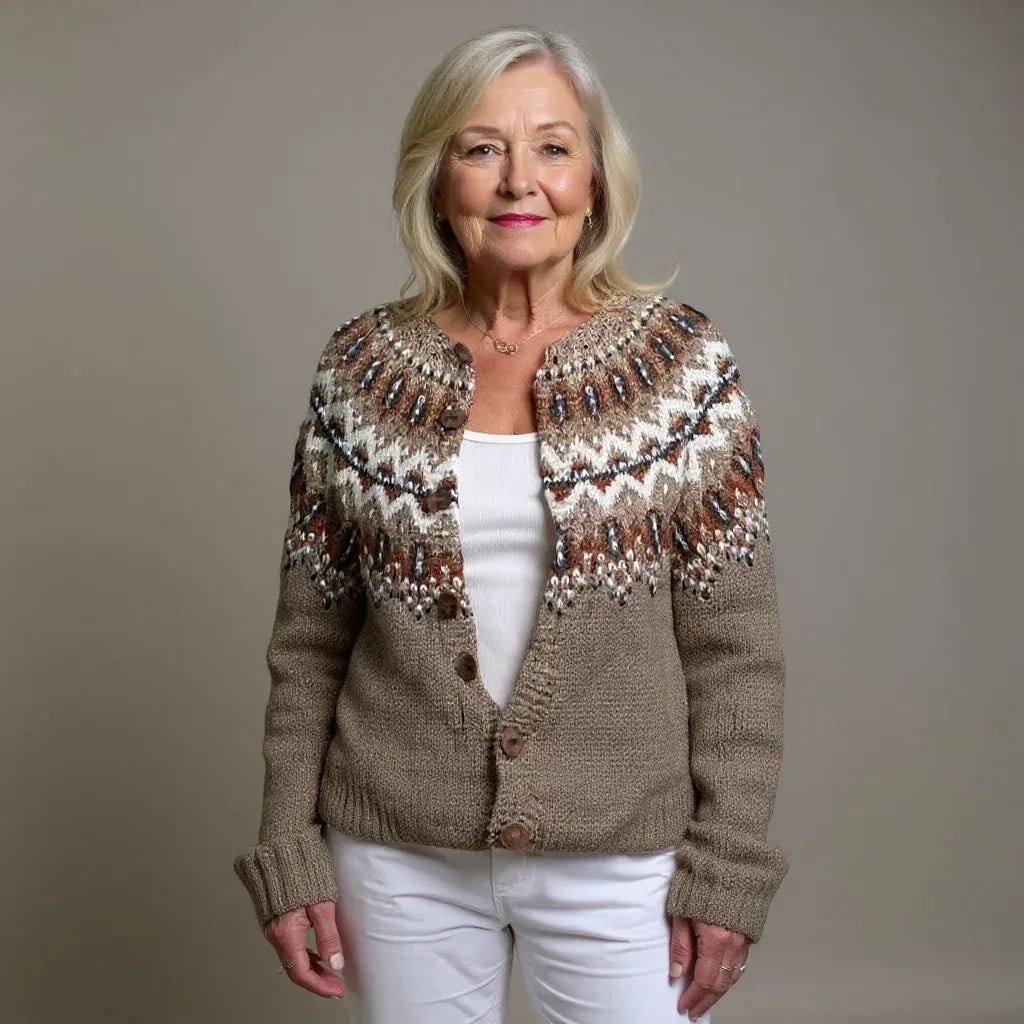 The Adeline Vintage Icelandic Cardigan embodies a perfect balance of heritage and style. With its beautiful, handcrafted yoke design featuring earthy tones, this cardigan adds a touch of Nordic charm to any outfit. The soft, knitted fabric ensures warmth and comfort, while the classic wooden buttons complete its rustic yet refined look. Layer this cardigan over your everyday pieces for an effortlessly chic and cozy finish.