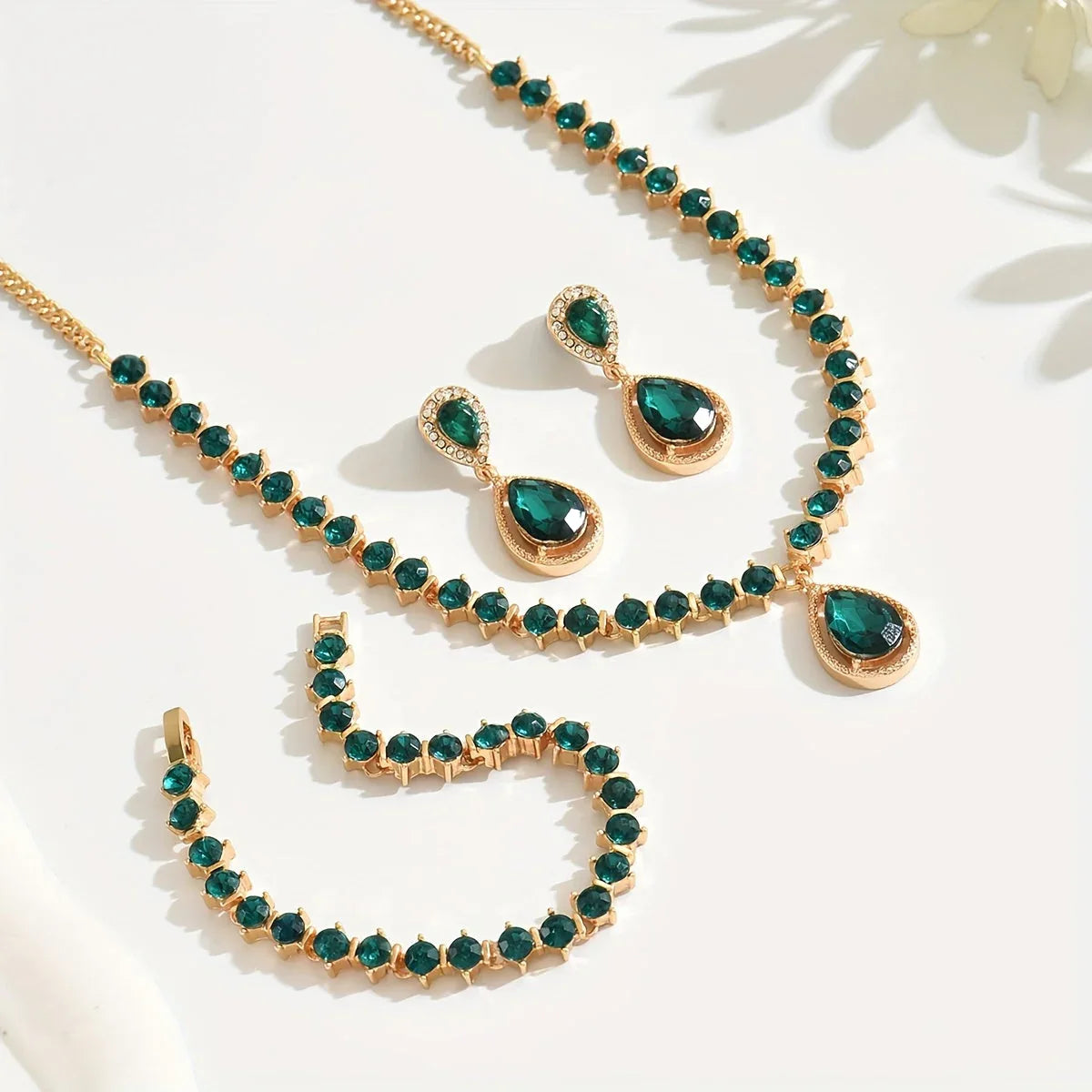 This 4-piece jewelry set features a geometric necklace, matching earrings, bracelet, and ring—all adorned with shimmering teardrop crystals. The faceted shapes catch the light beautifully, while the gold-toned frame adds a refined edge. Perfectly coordinated, this set creates an elegant, luxurious look with minimal effort.