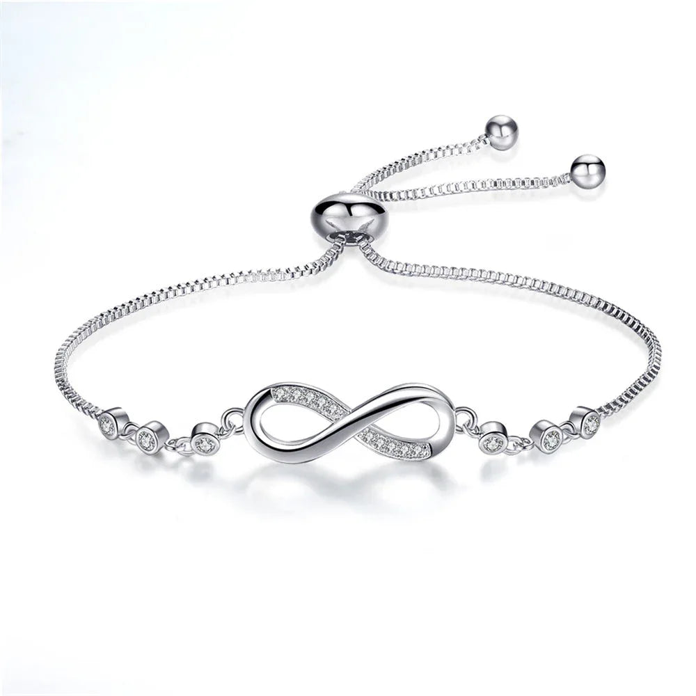 This radiant bracelet features the iconic infinity symbol, delicately adorned with sparkling zirconia and set on a sleek adjustable chain. Whether worn alone or layered, it serves as a beautiful reminder of eternal love, connection, and resilience.