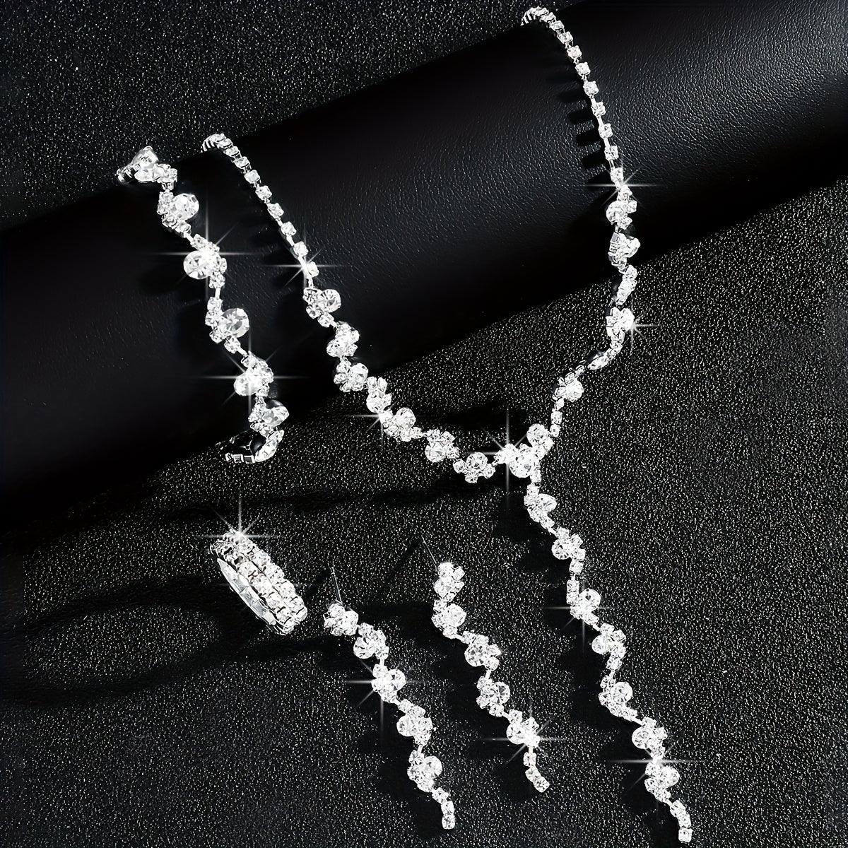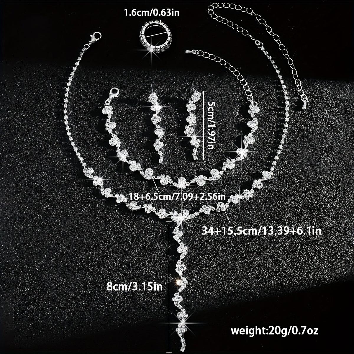 This dazzling five-piece set includes a drop necklace, bracelet, earrings, and two matching rings, each adorned with shimmering floral-shaped stones. The intricate design features delicate clusters of sparkle set in a warm-toned metal, creating a luxurious and cohesive look. Perfect for weddings, galas, or special celebrations, it instantly adds refined brilliance to any outfit.
