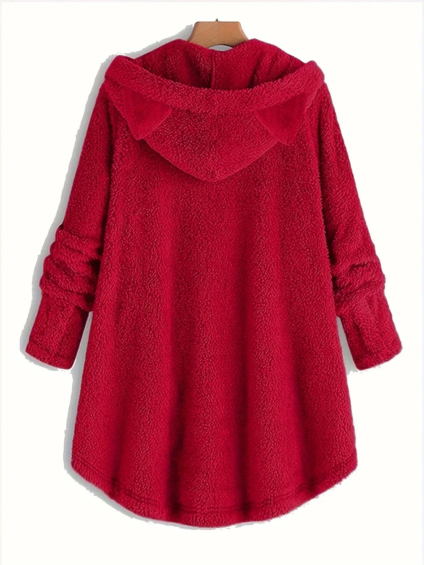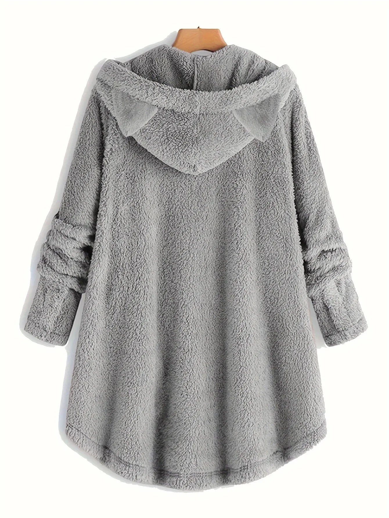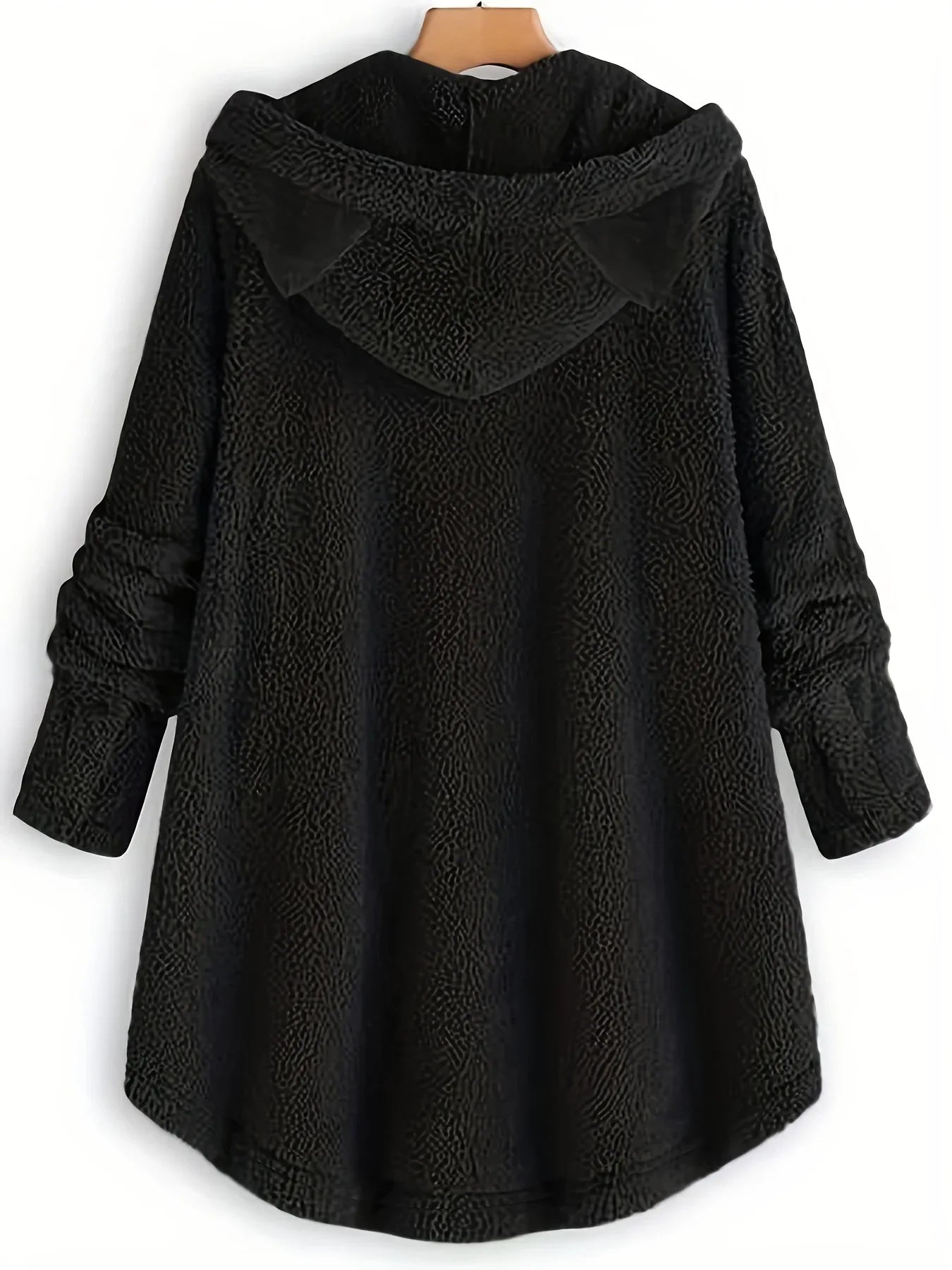 Made from plush fleece and finished with adorable cat ears on the hood, it’s the hoodie you reach for when you want comfort with character. The curved hem and side buttons give it a stylish twist, while the relaxed fit makes it perfect for lounging, layering, or running errands.