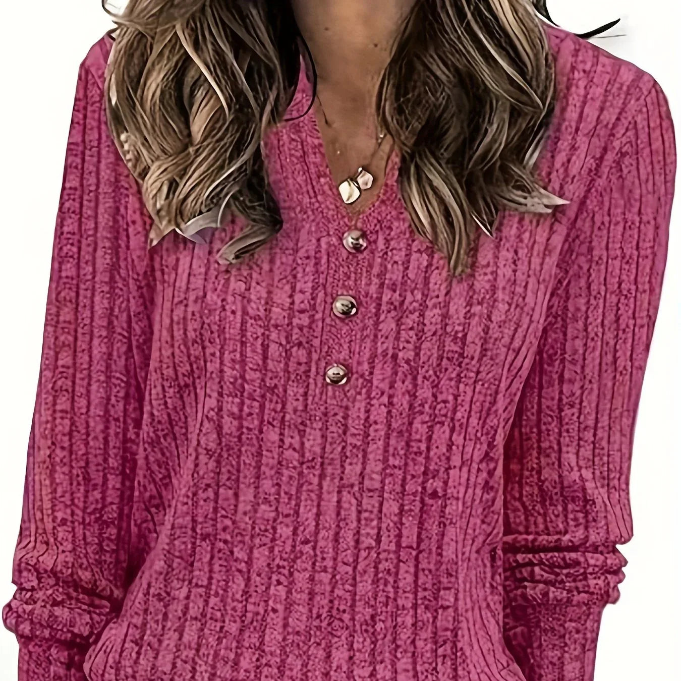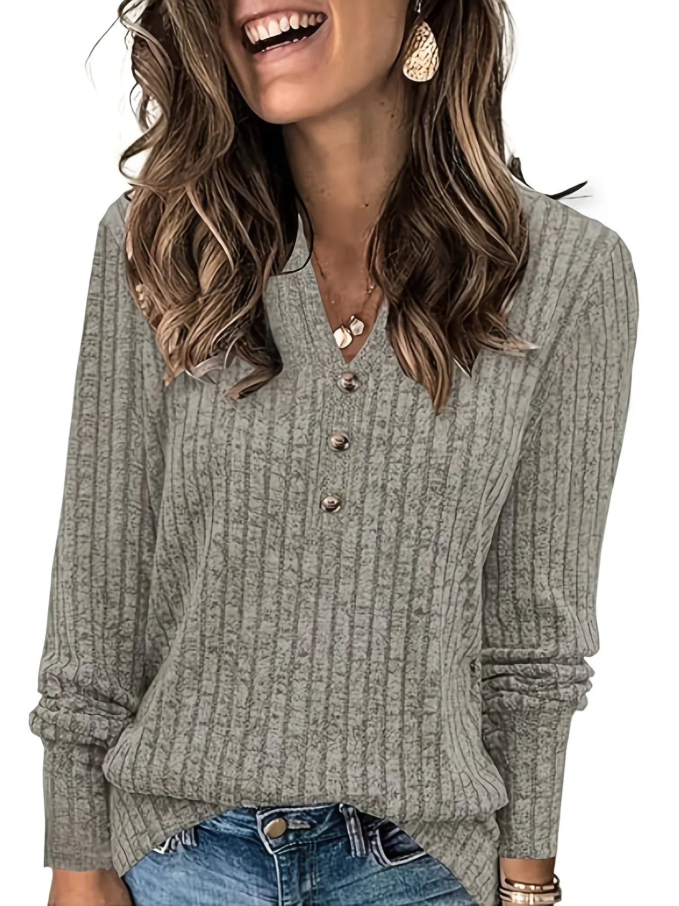 Soft, lightly stretchy, and comfortably lightweight, it drapes naturally around your shape without clinging. The vertical rib knit creates a flattering, lengthening look, while the subtle V-neck and button details add just the right touch of charm.